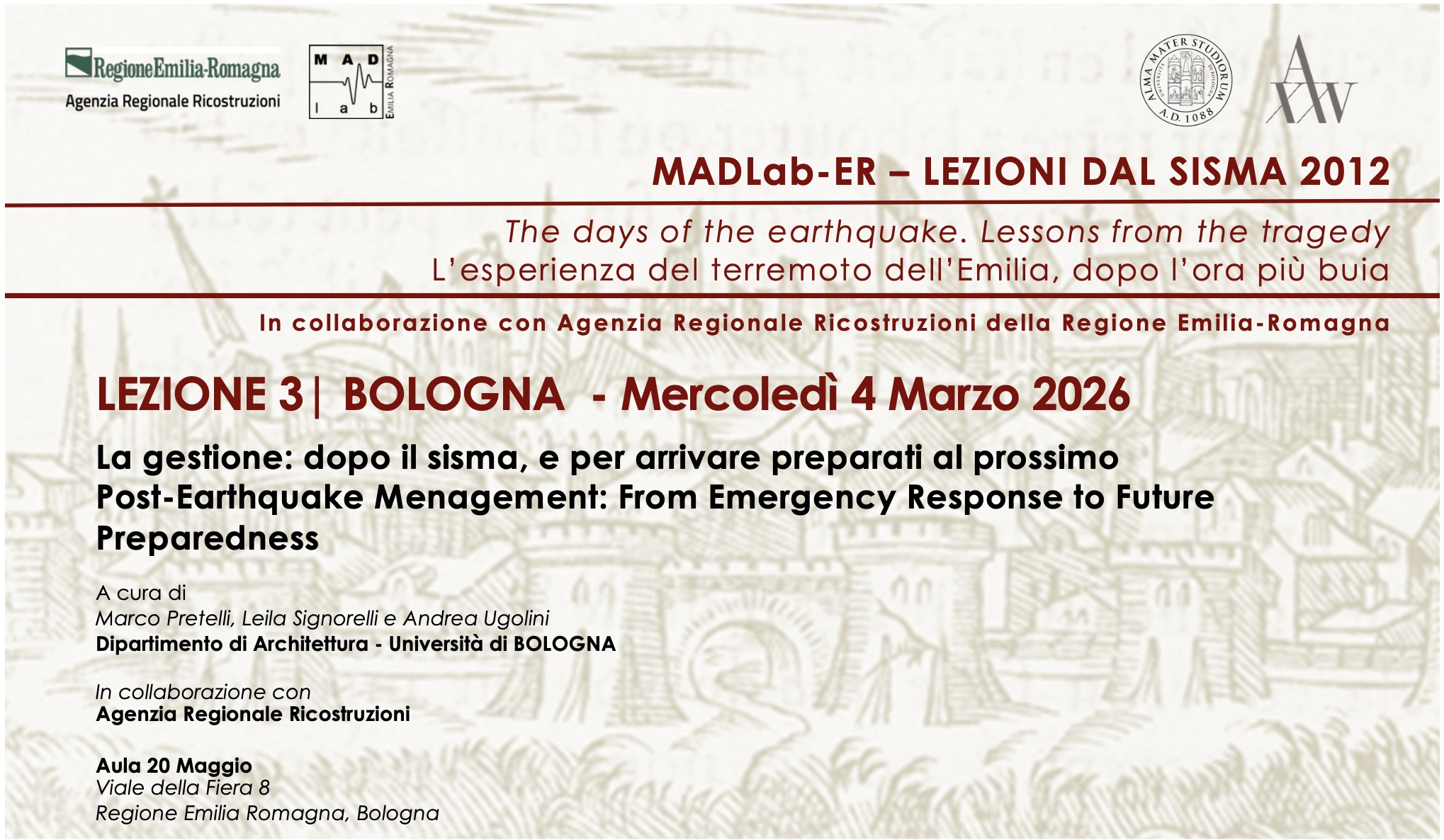 Third event in the Lessons from the 2012 Earthquake series organized by MADLab-ER. The initiative, launched within the Emilia-Romagna Reconstruction Agency, with the participation of the Region’s universities and the Superintendencies, aims to recount the experience of the 2012 Emilia earthquake as a “lesson to be learned” across the various aspects involved.