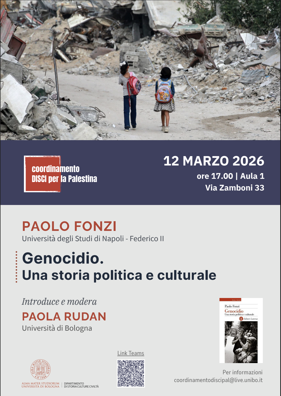 Il seminario, organizzato dal Coordinamento DiSci per la Palestina, propone una discussione sulla storia e l'uso politico del concetto di "genocidio" a partire dal volume Genocidio. Una storia politica e culturale (Laterza, 2025), insieme all'autore Paolo Fonzi (Università di Napoli "Federico II).